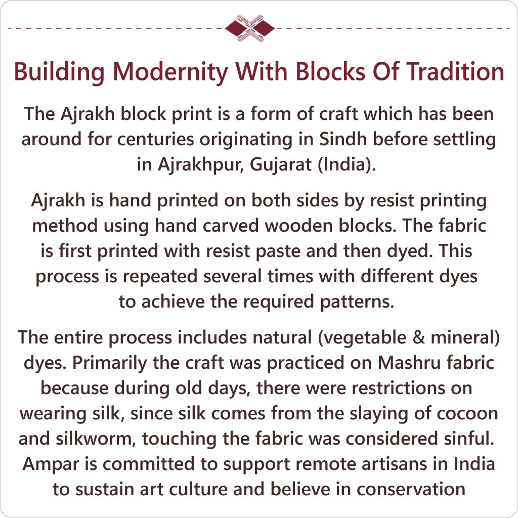 An exquisite hand block printed mashru stole from Ajrakhpur, Gujarat. This beautiful stole is decorated with a sophisticated assortment of red, blue and white floral patterns on a naturally dyed black background. This piece of fabric is hand block printed with intricate motifs of geometric flowers and shapes, giving it a royal look. It is ideal for all your ethnic, fusion and western wear.