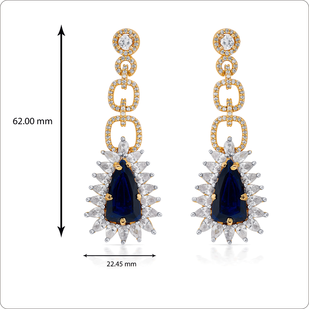 Studded to perfection to create a marvellous pair, these earrings are ideal to be worn at important events. With an embellished surface of white CZ stones, these earrings are beautified with drop-shaped blue CZ stones that are encircled with a spike design. Designed from brass with a gold plating, this pair is sure to blend well with your workwear formals or party dresses.