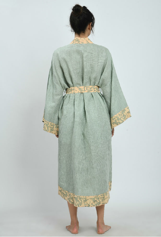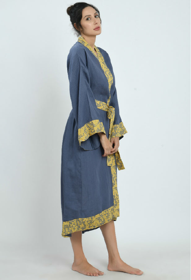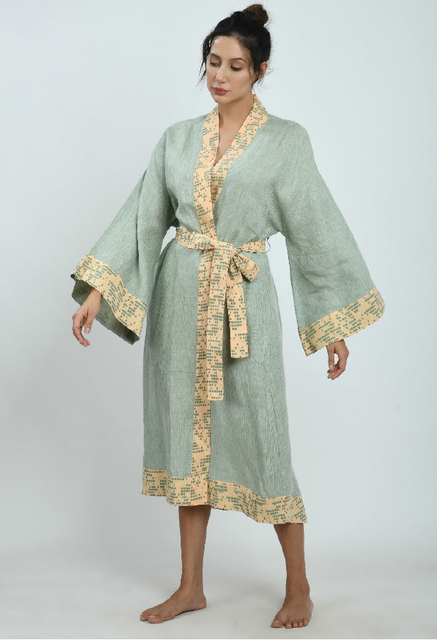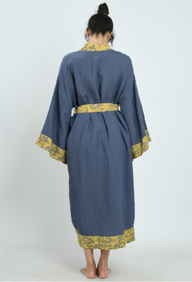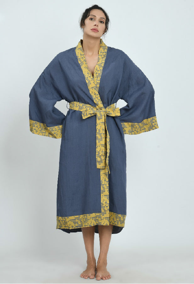 The full length and wide sleeves of this kimono are beautifully defined by the block printed edging in contrasting colours. Wrap up in it for a lazy Sunday morning then take it out to the beach for a light layer to save your skin in the sun.